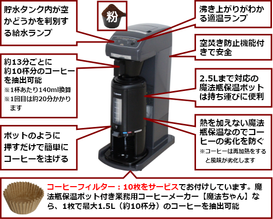 魔法瓶保温ポット付き 業務用コーヒーメーカー 【魔法瓶ちゃん】 持ち運びに便利な保温ポット付きで 保温&手軽さのいいとこ取り!