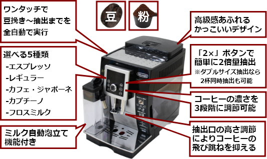 デロンギ高機能 コーヒーマシン 【全自動ちゃん】 1杯1杯丁寧に抽出! 豆から挽いた本格コーヒーを提供